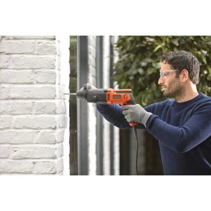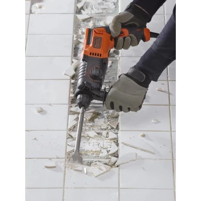 Der praktische Bohrhammer BEHS01K von Black+Decker mit leistungsstarken 650 W unterstützt Sie bei leichten Bohr- und Schlagbohrarbeiten in Stein, Naturstein und Beton. Mit einer Schlagzahl von 5.500/min erzielt der Schlagbohrer ein sauberes und effizientes Ergebnis. Die max. Schlagkraft beträgt 1,4 J, wodurch sich der Bohrhammer sowohl fürs Bohren in harten Materialien wie Stein und Beton als auch zum Meißeln, Stemmen sowie zum Abtragen von Fliesen bestens eignet.