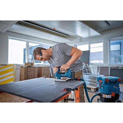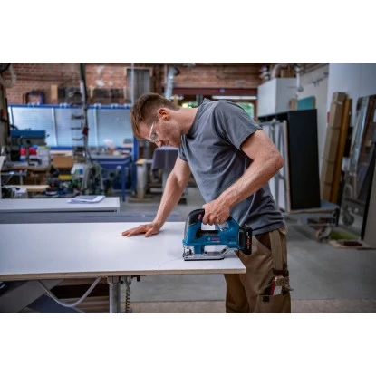 Sie eignet sich ideal für Rund- und Querschnitte in Massivholz, Spanplatten und Holzverbundwerkstoffen sowie in dickeren oder härteren Materialien. Sie ist kompatibel mit Führungsschienen (über Adapter) und allen Bosch Professional 18V-Akkus und -Ladegeräten (Professional 18V System).