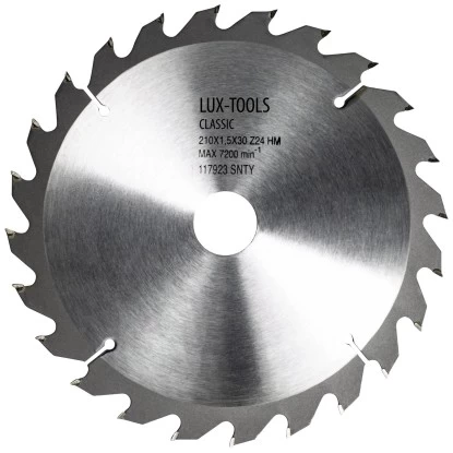 Das LUX-TOOLS HM-Kreissägeblatt mit einem Durchmesser von 210 mm und einer Bohrung von 30 mm eignet sich für Handkreissägen zum Sägen von Weich- , Hart- und Exotenhölzern (längs und quer zur Maserung), Spanplatten, Furnierholz, Tischlerplatten, Gipskarton und Vollholzplatten. Das widerstandsfähige Sägeblatt ist mit 24 Hartmetallzähnen bestückt.