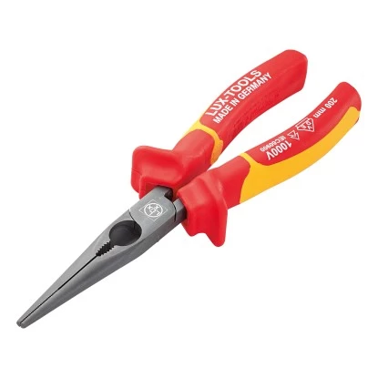 Die LUX-TOOLS Telefonzange Comfort eignet sich optimal zum Halten, Greifen, Schneiden oder auch Drehen von Elektronikbauteilen und Drähten. Sie besitzt flache, spitz zulaufende Backen, damit der Fachmann leicht in schmale Öffnungen gelangen kann. Mit der Schneidfunktion können Sie auch harte Drähte sauber durchtrennen. Die Länge von 200 mm ermöglicht einen weiten Aktionsradius bei Verdrahtungen in Schaltschränken. Für eine lange Lebensdauer sind die Backen induktiv gehärtet, geschliffen und poliert. Sie besitzen eine sehr gute Korrosionsbeständigkeit. Mit den geriffelten Bereichen erfassen Sie die Bauteile oder Drähte schonend und präzise, ohne dass sie abrutschen können.