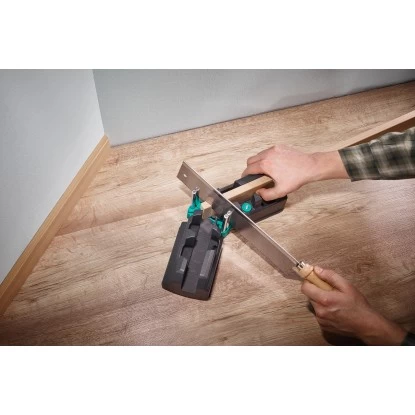 Die Schmiege und Schneidlade zum Messen und Sägen exakter Gehrungen ist ein cleveres 2-in-1-Produkt, das Ihnen perfekt angepasste Fußleisten garantiert und den Einsatz einer Winkelschmiege überflüssig macht. Auch das mühsame und fehleranfällige Tüfteln beim Übertragen des richtigen Winkels auf die Säge ersparen Sie sich. Ecken von 85° bis 180° greifen Sie komfortabel ab. Im zweiten Schritt setzen Sie die Fußleiste in die vorgesehenen Führungen und sägen sie mit der Feinsäge. Die automatische Winkelhalbierende sorgt für präzise Gehrungen. Mit der Schmiege und Schneidlade gelingen Ihnen selbst in windschiefen Altbau-Ecken perfekte Fußleistenübergänge.
