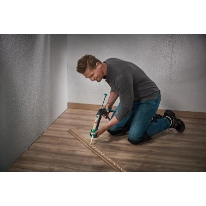 Zur Befestigung der Sockelleisten an der Wand verwenden Sie am besten einen geeigneten Montagekleber in einer 310-ml-Kartusche, den Sie mit der Kartuschenpresse MG 200 kraftschonend und kontrolliert auftragen können. Die MG 200 überzeugt mit praktischen Komfortfeatures, die auch bei längerer Anwendungsdauer ermüdungsarmes Arbeiten unterstützen. Sie eignet sich mit 130 kg Auspressdruck optimal für Kleber, Silikon und Acryl. Durch den 2-Komponenten-Griff liegt die Presse angenehm in der Hand. Zusätzlich ist die MG 200 mit einer drehbaren Kartuschenhülse ausgestattet. Dadurch können Sie sie in der Anwendung flexibel in den günstigsten Arbeitswinkel eindrehen. Der automatische Tropfstopp verhindert das ungewollte Nachlaufen des Materials. So gelingen Ihnen das Verkleben der Sockleleisten sauber und präzise.